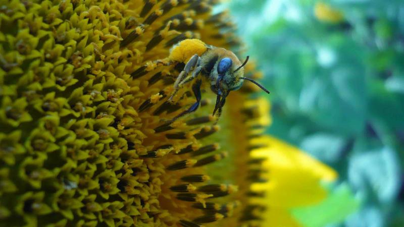 Image: Bees (such as the solitary Melissoptila tandilensis in the Argentine Pampas, above), play an important role in the production of sunflowers and other crop plants. Photo credit: Malena Sabatino