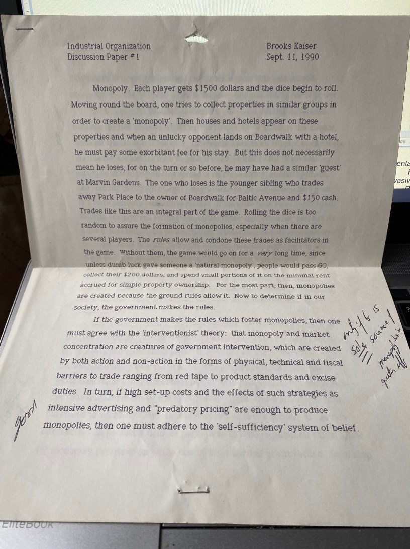 Our department moved offices in the last couple of weeks. As I was unpacking in my new digs (pictured below), something fell to the floor from box. Amazingly, after moves all over the world, I still have the first paper I wrote as a senior undergraduate in my Industrial Organization class 30 years ago – back when Sept. 11 was just another day at the beginning of the school year (cover photo).