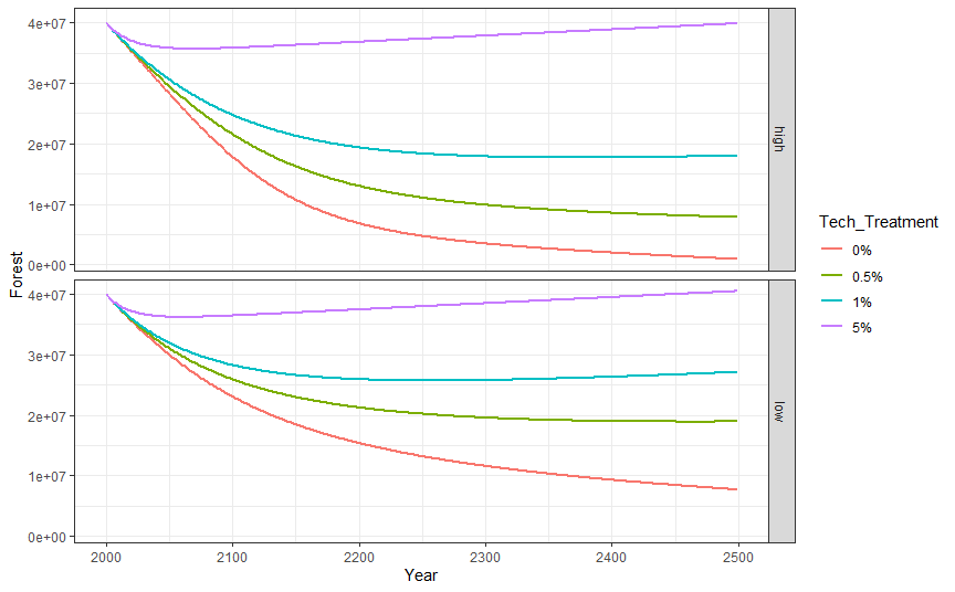 In the next figures (3&4) I show what the introduction of technological progress does. I include the original level of technological progress (0%) for reference. In the optimistic ( is high scenario introduction of minimal technological progress of 0.5% per year lengthens the time until carrying capacity by about 50 years (Figure 3). Using slightly larger technological progress (1% per year) and we never exceed carrying capacity. As we can see in the forest amounts the forest doesn’t get destroyed either (Figure 4). Things look less promising in the pessimistic scenario. In that case we need at least 5% technological progress per year not to exceed the carrying capacity.