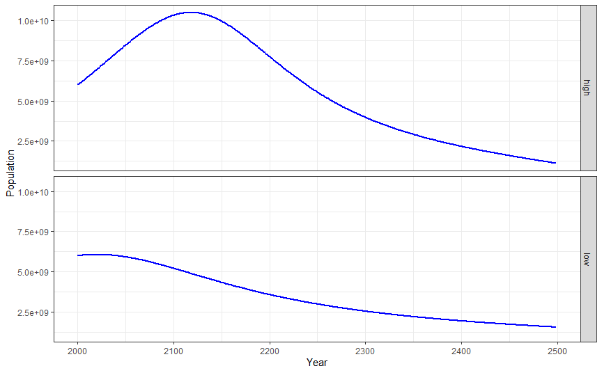 they consider: a low one which means that we reach carrying capacity quite soon and a high one, where we don’t reach carrying capacity for another 100 years or so (I reproduce their figures below).