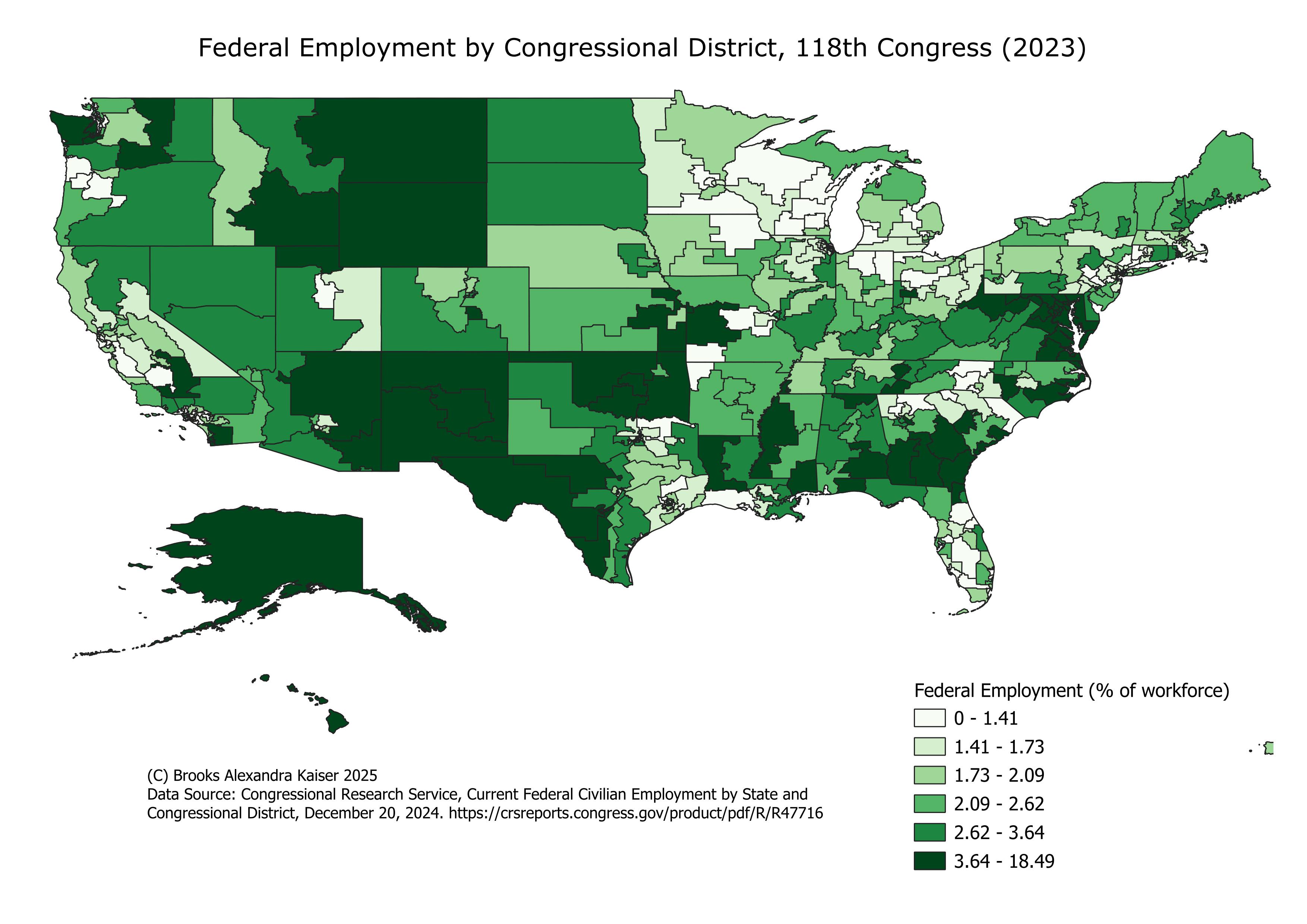 The DOGE approach decidedly is not about living with and for each other. It is clumsy and costly both in the present and the long run. Lawsuits are erupting throughout federal agencies. No one with options will seek a federal job and we can expect the quality of future employee effort to deteriorate rapidly and significantly, given the uncertainty and unpleasantness of the work environment. Federal workers are not some monolithic group in the greater Washington DC area. They live and work in our communities, and they vote. The map shows the percentage of federal civilian workers (excluding some groups like the post office as well as the military) by congressional district.